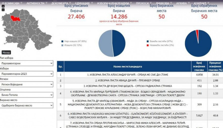 Inače, do 22 sata je obrađeno 8.104 od 8.273 biračkih mesta, a 3.756.877 birača.
