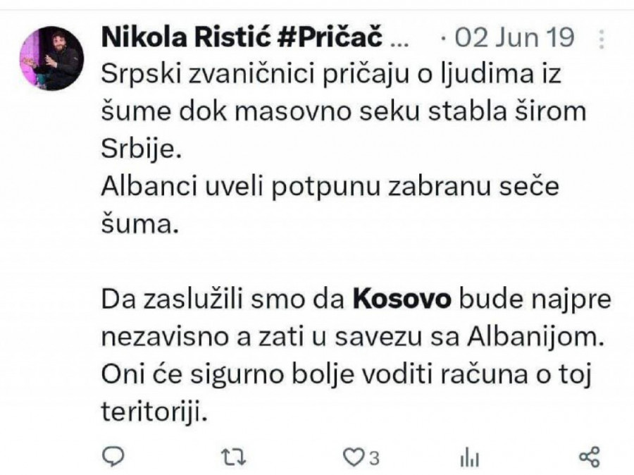 - Srpski zvaničnici pričaju o ljudima iz šume dok masovno seku stabla širom Srbije. Albanci uveli potpunu zabranu seče šuma. Da zaslužili smo da Kosovo bude najpre nezavisno, a zatim u savezu sa Albanijom. Oni će sigurno bolje voditi računa o toj teritoriji - pisao je Ristić na društvenoj mreži X.