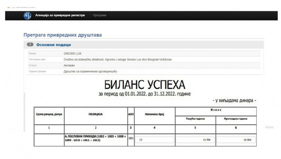 Frirma "Gnosis Luks" u 2022. ostvarila je poslovni prihod od 10.704.000 dinara, što je oko 100.000 evra, dok je u 2021. prihodovala 16.364.000 dinara, odnosno oko 140.000 evra!