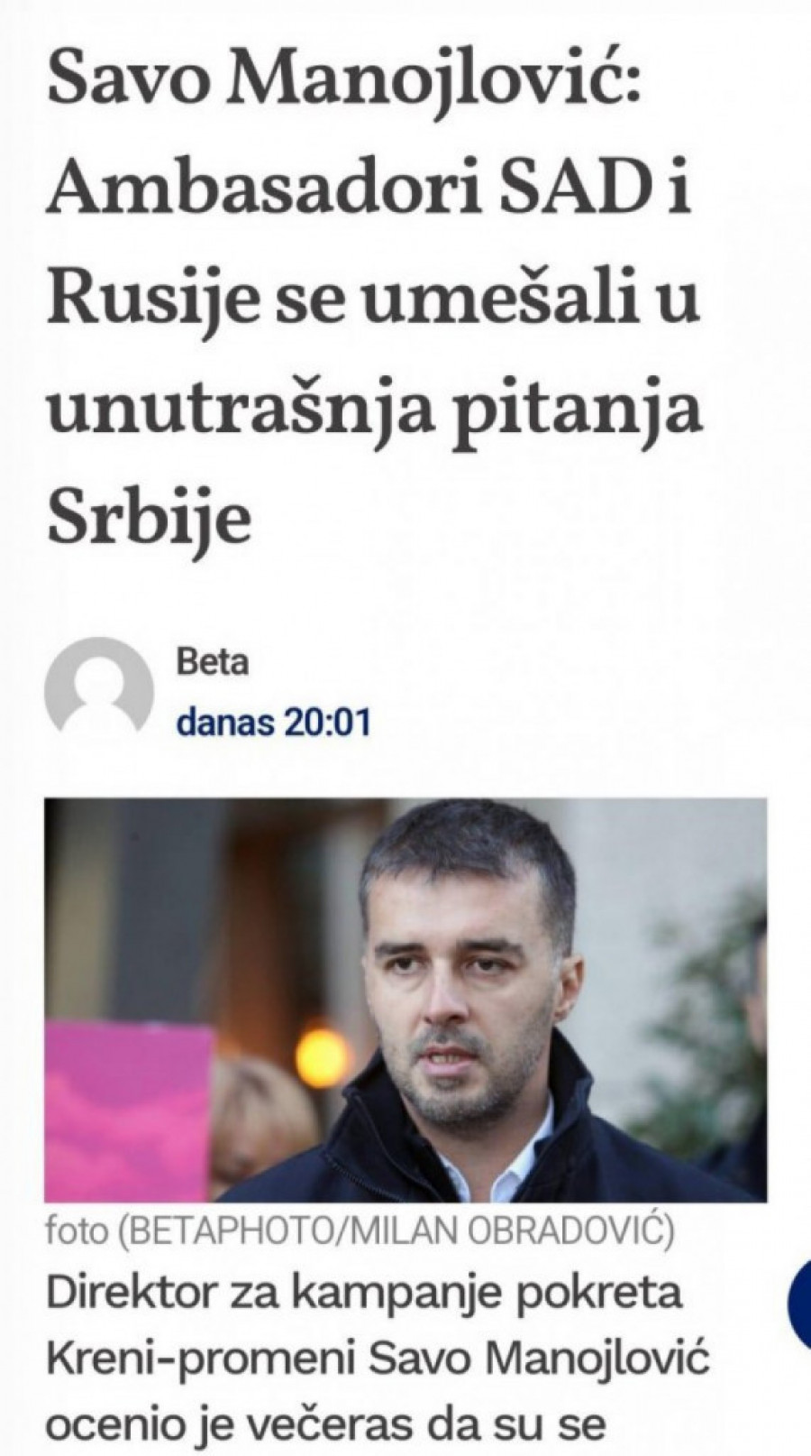 Direktor za kampanje pokreta Kreni-promeni, Savo Manojlović, izneo je oštre optužbe na račun ambasadora Amerike i Rusije u Beogradu, Kristofera Hila i Aleksandra Bocan-Harčenka. Prema Manojloviću, njihova podrška lideru vladajuće koalicije Aleksandru Vučiću predstavlja mešanje u unutrašnja pitanja Srbije. Ovo mišljenje podržao je i Zdravko Ponoš, jedan od lidera opozicije, koji je uputio uvredu američkom ambasadoru, optužujući ga da ide "na pecanje sa Bocan-Harčenkom".