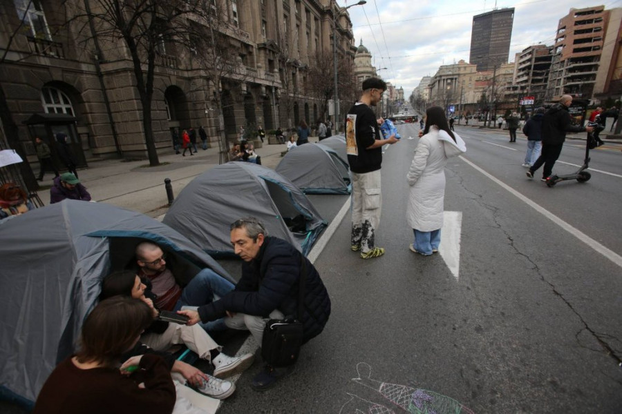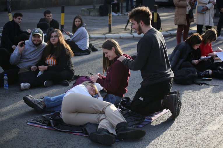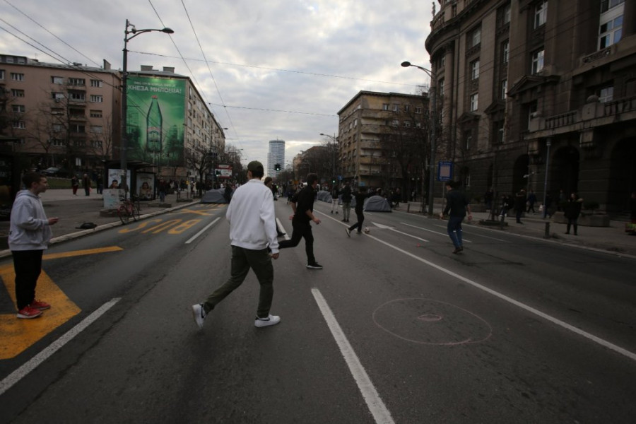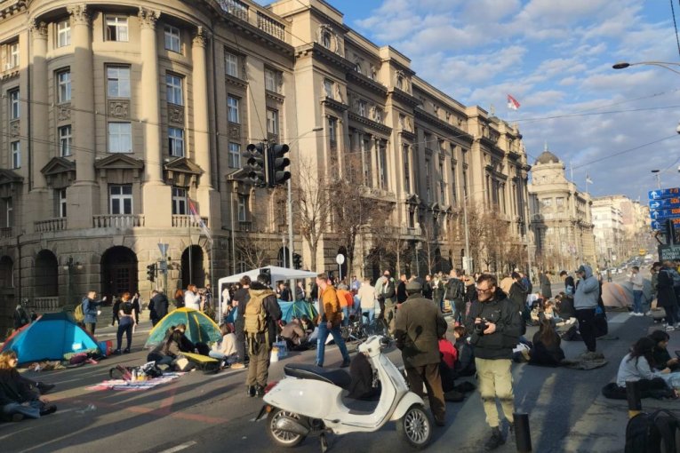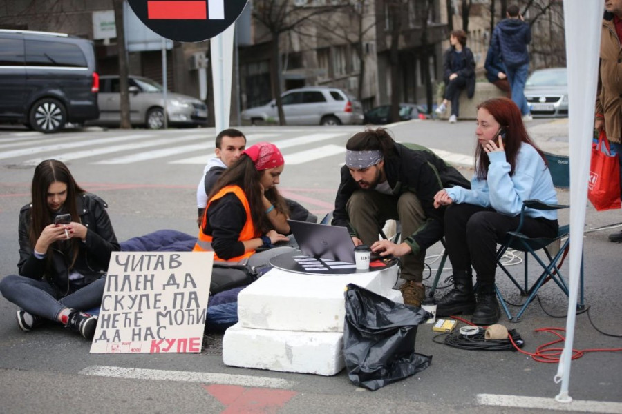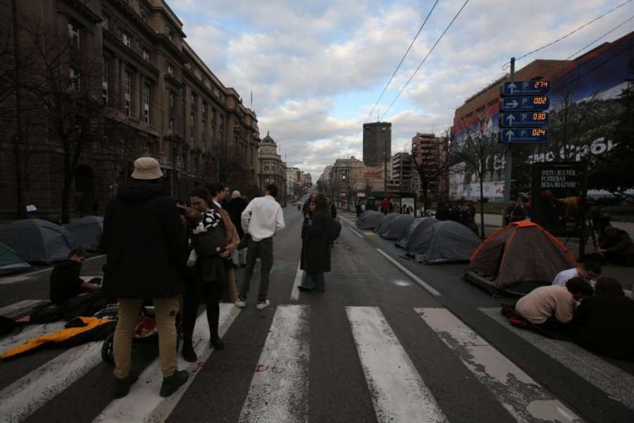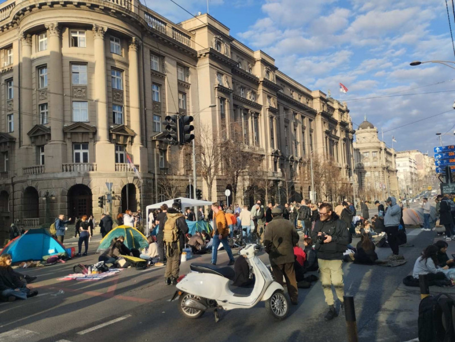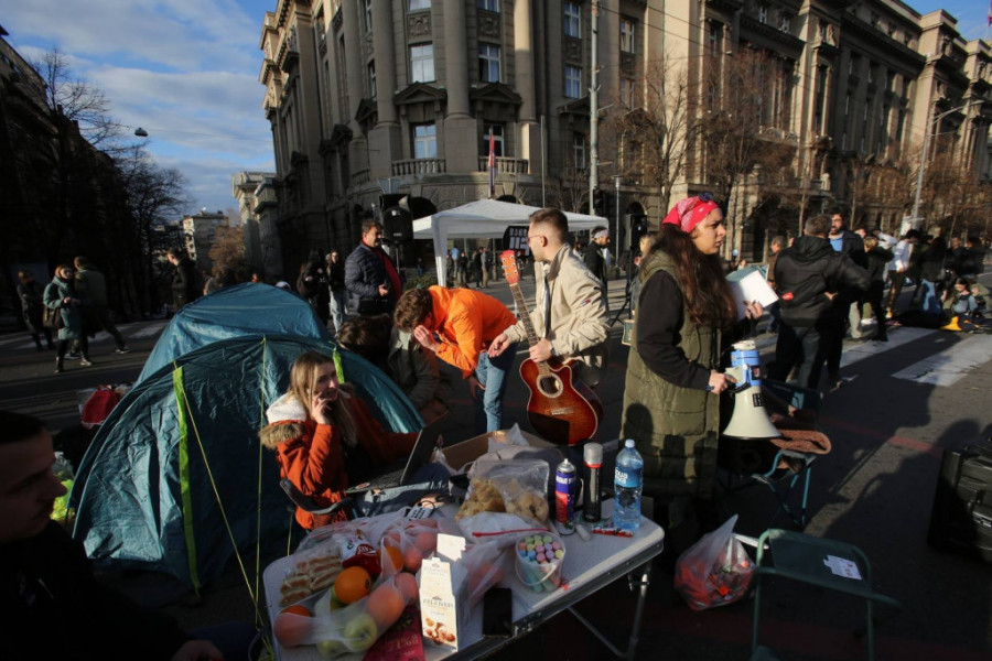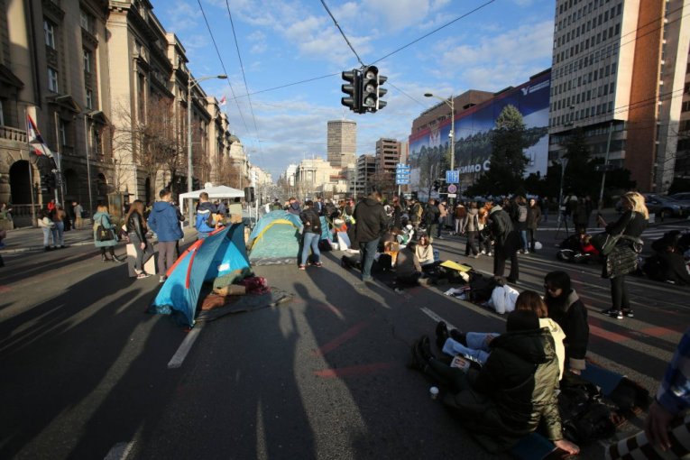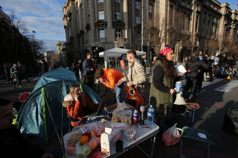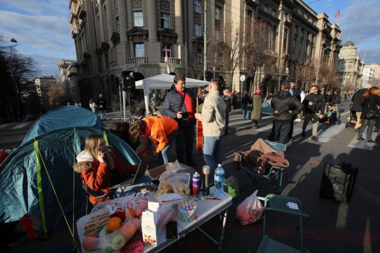 Studenti su na raskrsnici počeli da montiraju šatore, a doneli su i agregat, zvučnike, ćebad, montažne stolove..., jer nameravaju, kako su ranije najavili, da na ulici provedu 24 časa.