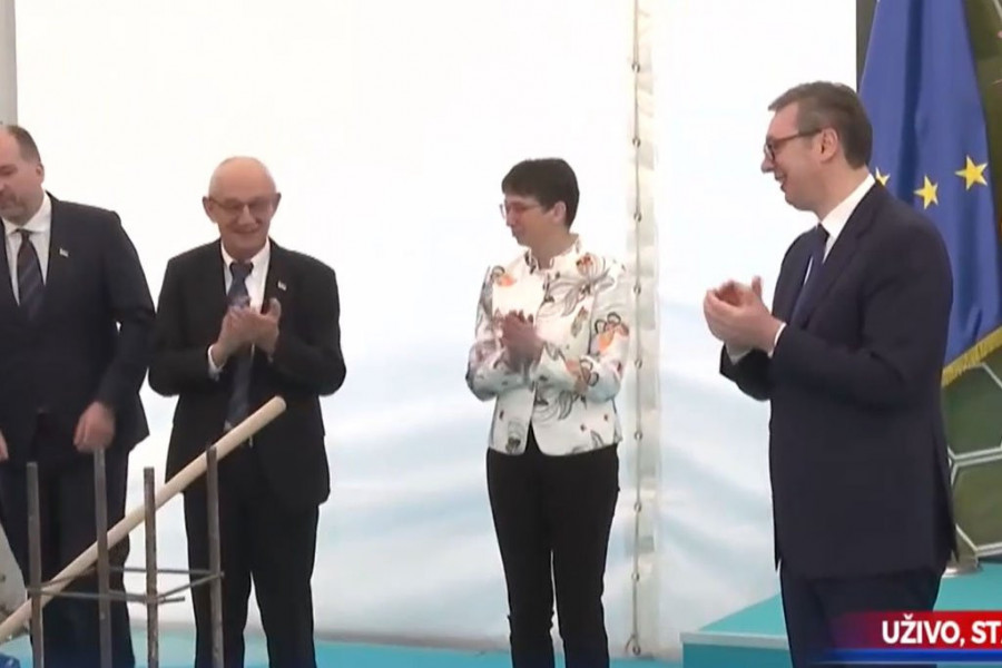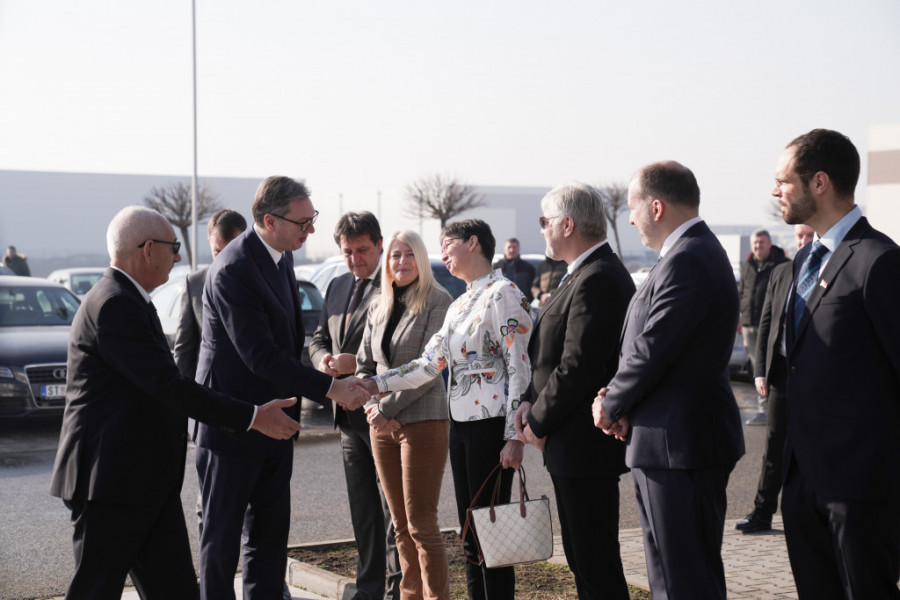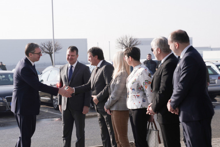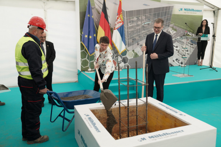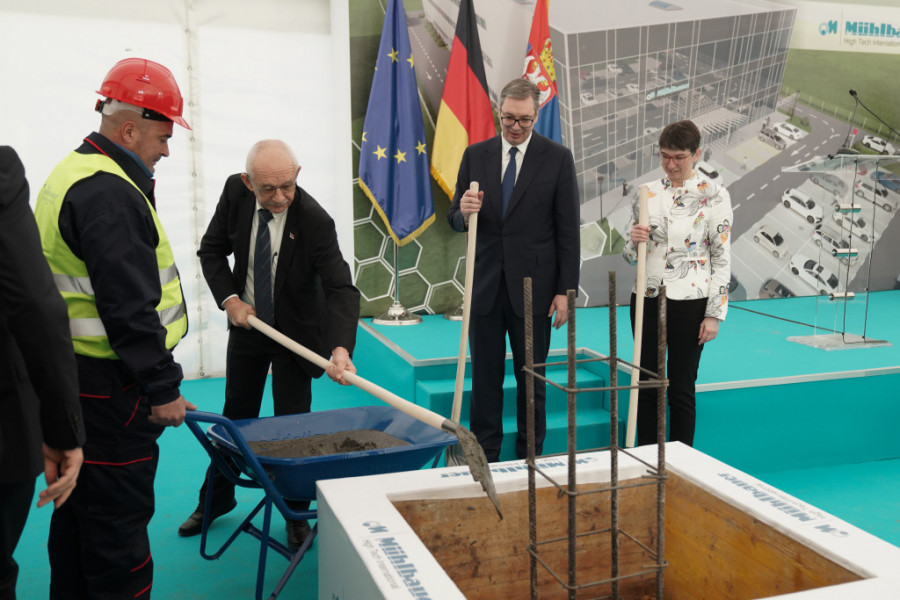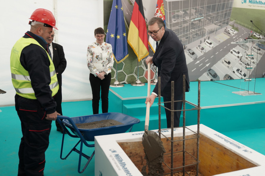 Predsednik Srbije Aleksandar Vučić prisustvuje svečanoj ceremoniji polaganja kamena temeljca za izgradnju nove fabrike kompanije Muehlbauer Group u Staroj Pazovi.
