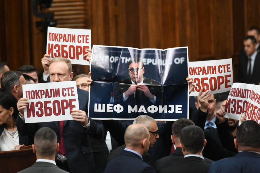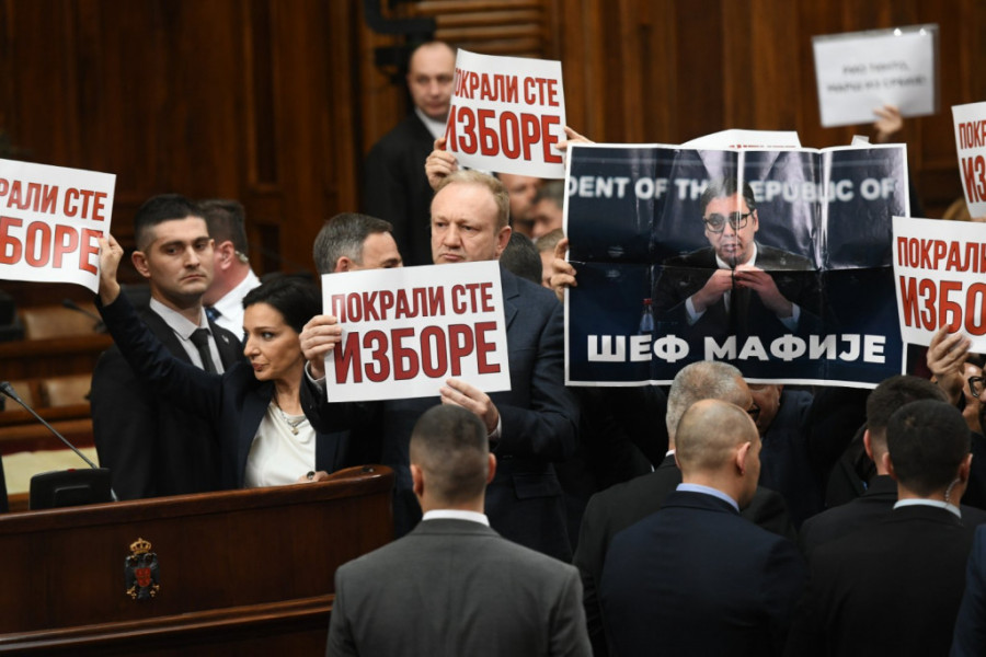 Skupština Srbije počela je zvižducima opozicionih poslanika i uzvicima i bukom, a drže i transparente na kojima piše:"Pokrali ste izbore".