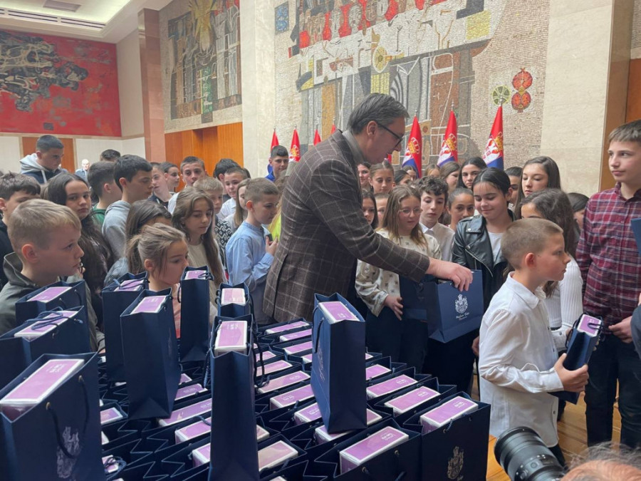 Predsednik Republike Srbije Aleksandar Vučić primio je danas oko 10 sati učenike osnovnih škola sa Kosova i Metohije u Palati Srbija.