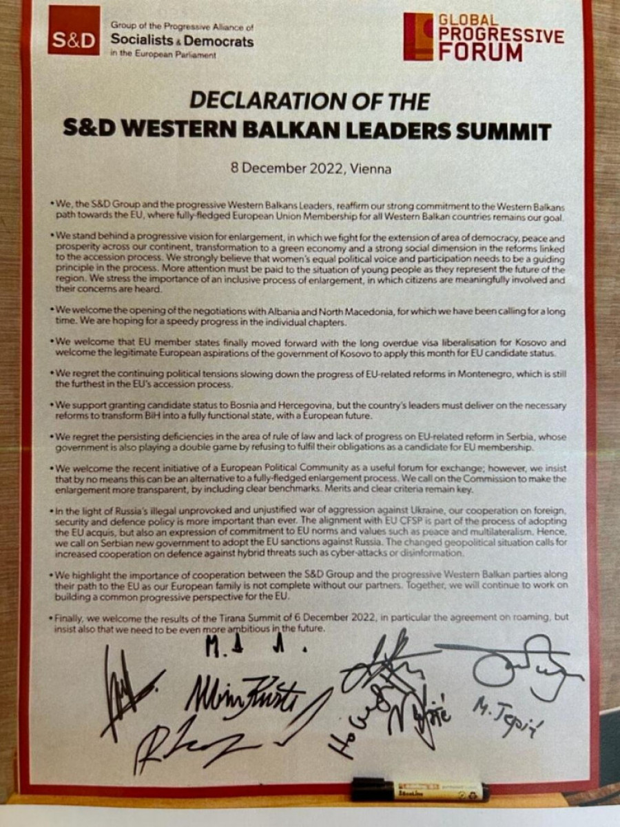 Na nedavno održanom Samitu lidera zapadnog Balkana, održanom u Beču 8. decembra 2022. godine, premijerka Ana Brnabić je pokazala Deklaraciju S&D (socijalista i demokrata) koja je izazvala pažnju javnosti. Ovaj dokument, sastavljen od 11 tačaka, izazvao je posebnu pažnju zbog svoje reference na tzv. Kosovo i njegovu budućnost u Evropskoj uniji.