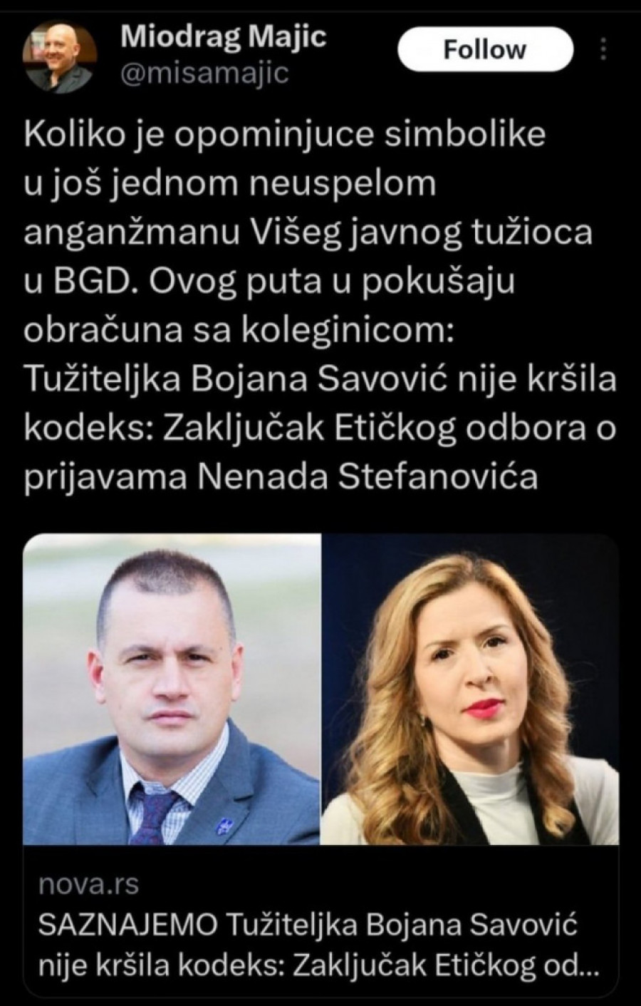 Glavni javni tužilac VJT u Beogradu Nenad Stefanović podneo je niz inicijativa Etičkom odboru i disciplinskih prijava protiv tužiteljke Bojane Savović, navodeći da je prekršila načela nepristrasnosti i ugrozila poverenje u javno tužilaštvo svojim političkim nastupima tokom izborne kampanje za izbore održane 17. decembra 2023. godine.