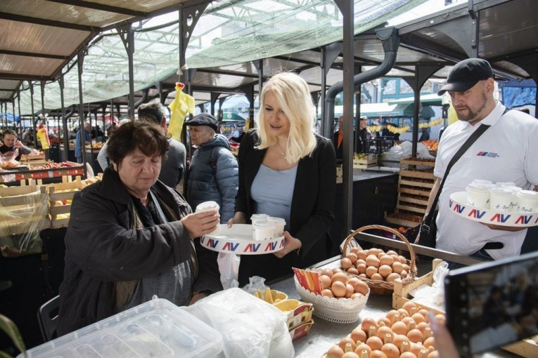 Ministarka za brigu o porodici je radnicima na pijaci podelila kafu i topli napitak ispred Srpske napredne stranke.