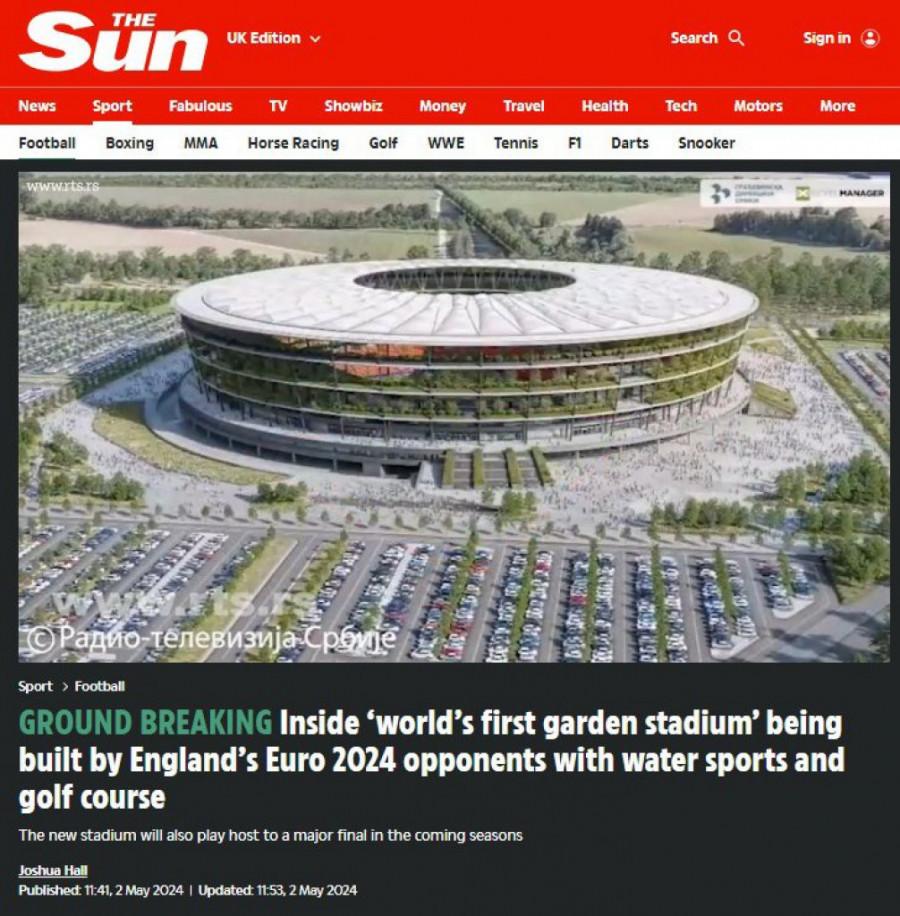 - Srbija je otkrila projekt za novi stadion. Fascinantno izgleda ovo tehnološko remek-delo, koje će biti okruženo drvećem i zelenilom. Srbija planira izgradnju veličanstvenog stadiona i okreće se ekološkom pristupu i dizajnu. Predsednik Aleksandar Vučić kaže da će ovo biti jedno od tri najlepša mesta za igranje fudbala na svetu - naveo je engleski list.