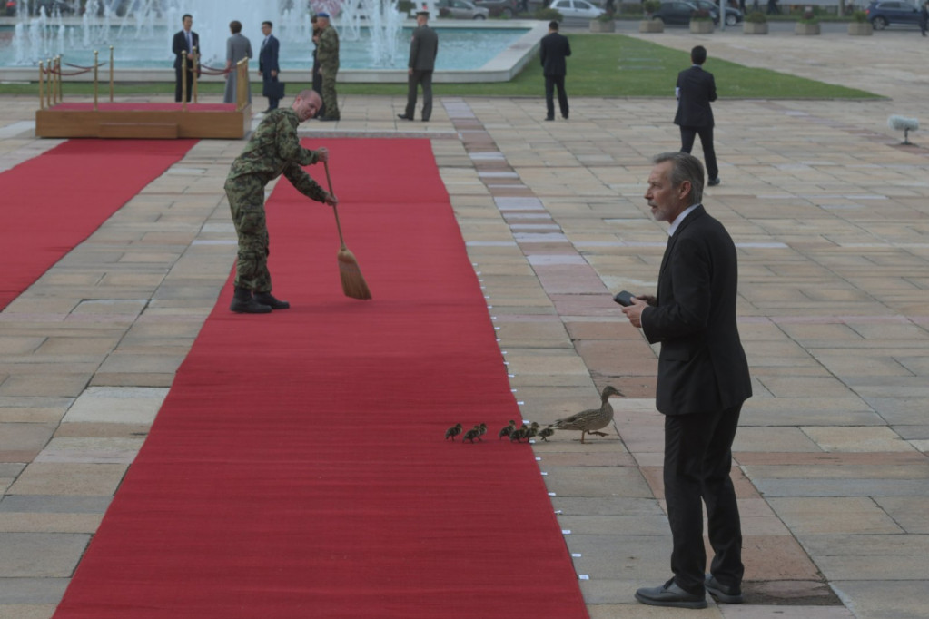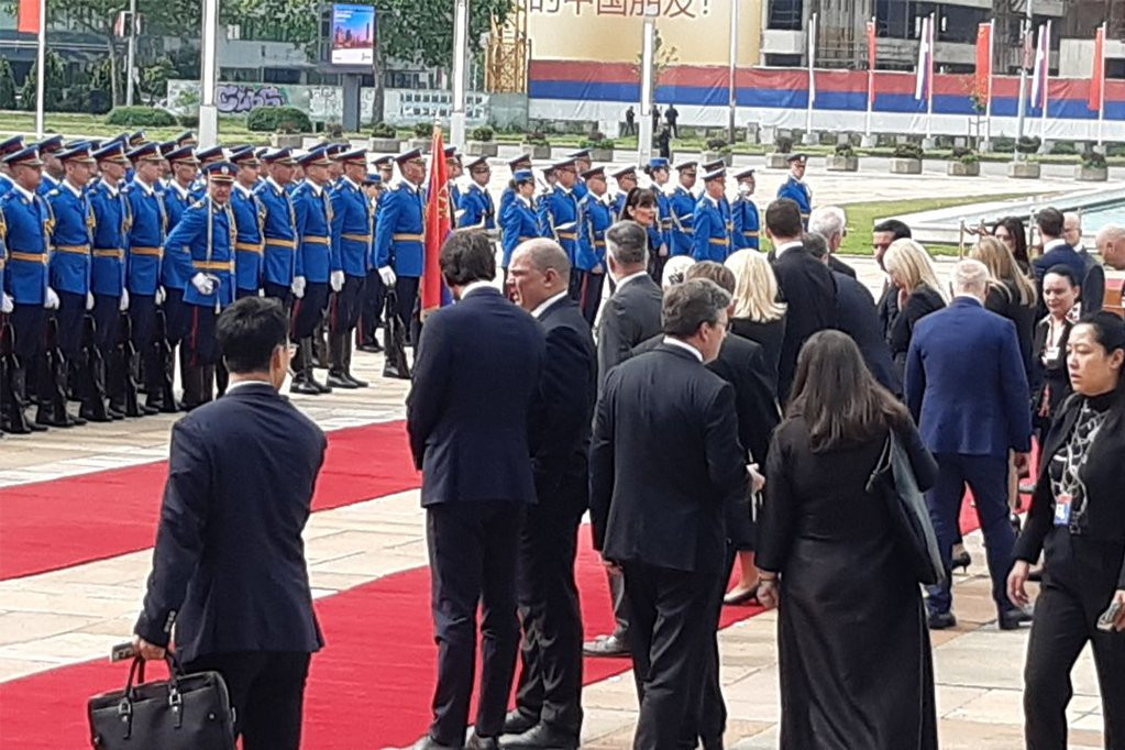 Predsednika NR Kine na crvenom tepihu dočekali su predsednik Vučić sa suprugom Tamarom Vučić, kao i premijer Miloš Vučević sa članovima i potpredsednicima vlade i guvernerka Narodne banke Srbije Jorgovanka Tabaković.