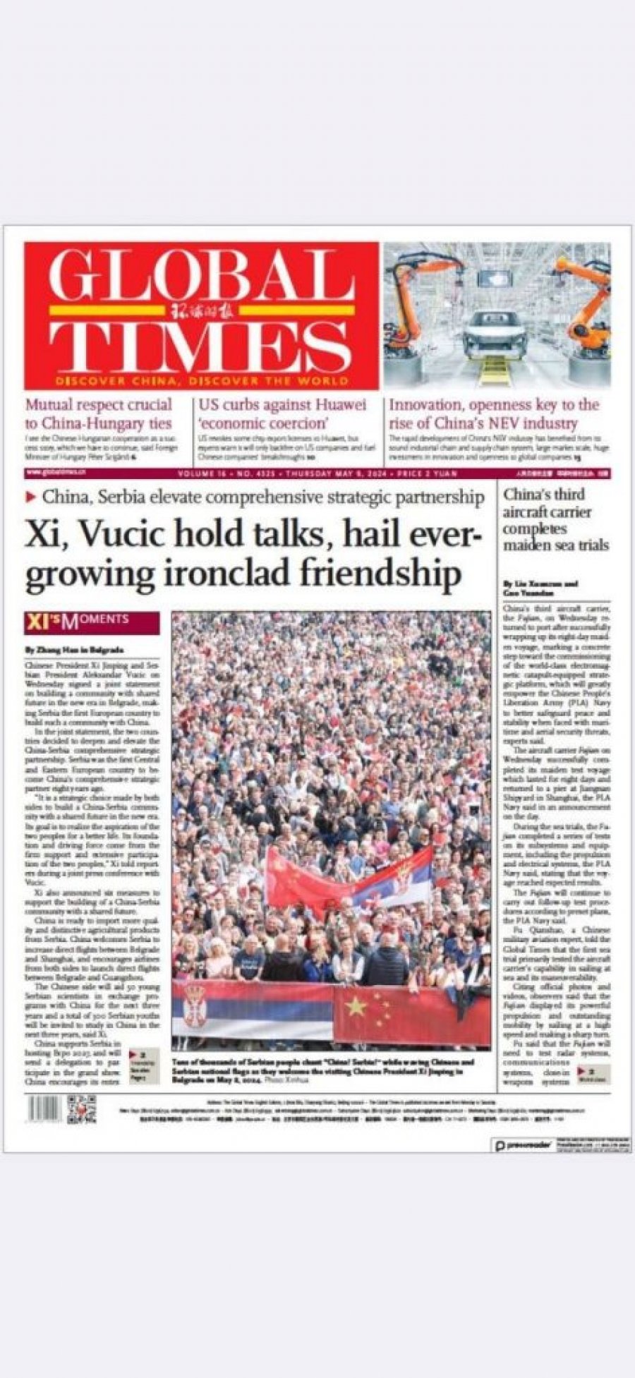 "Vučić i Si pozdravili rastuće čelično prijateljstvo", ističe kineski list Global tajms, uz fotografiju srpskog naroda koji se juče okupio ispred Palate Srbija da pozdravi kineskog predsednika.