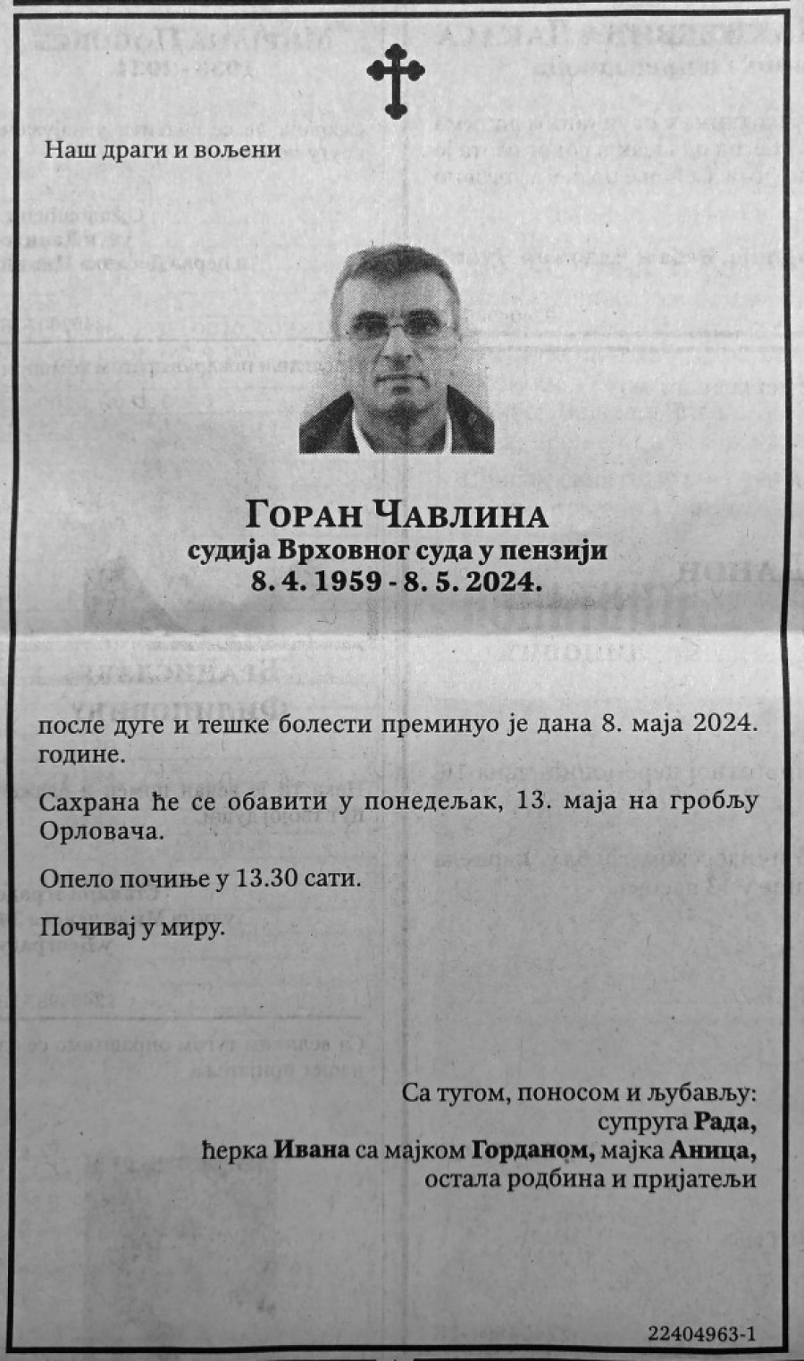 "Naš dragi i voljeni Goran Čavlina, sudija Vrhovnog suda u penziji, preminuo je posle duge i teške bolesti..."