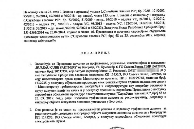 Kako kaže sagovornik Republike dobro upućen u ceo slučaj, Ministarstvo prosvete i Vlada su svojim postupanjem i izdavanjem zaključka i daljih ovlašćenja na najefikasniji način, a što je trebalo, inače, da uradi UNDP, jer je za poslove upravljanja tim procesima i plaćen, shvatili i pritom i potvrdili izdatim dokumentima, da je kompletna investiciono-tehnička dokumentacija koju je izradio studio "Bureau cube partners DOO" kompletna.