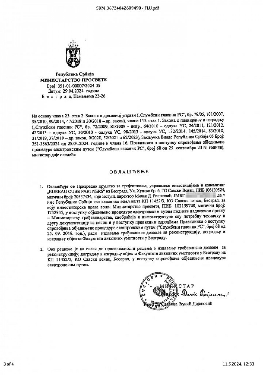 Finansijer projekta je Ministarstvo prosvete Srbije, čiji su predstavnici takođe dovedeni u zabludu od pojedinaca iz UNDP, koji su im tvrdili da arhitektonski studio nije na vreme uradio ono što je trebalo, te da zbog isteka roka ne treba da im se plati. U međuvremenu su i u ministarstvu koje vodi Slavica Đukić Dejanović utvrdili o čemu se radi i zato je prvo Vlada Srbije donela zaključak kojim se saglasila na prenos investitorskih prava sa Republike Srbije na Ministarstvo prosvete, a potom je Ministarstvo prosvete ovlastilo "Bureau cube partners DOO" da može da podnese zahtev za izdavanje građevinske dozvole. Time je nesporno potvrđeno da je arhitektonski studio završio na vreme sve ugovorene poslove i iskazuje se namera Ministarstva prosvete da se postupak s tim studijom nastavi i dovede do kraja.