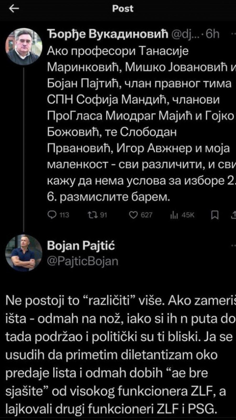 - Ne postoji to “različiti” više. Ako zameriš išta - odmah na nož, iako si ih n puta do tada podržao i politički su ti bliski. Ja se usudih da primetim diletantizam oko predaje lista i odmah dobih “ae bre sjašite” od visokog funkcionera ZLF, a lajkovali drugi funkcioneri ZLF i PSG. Bukvalno ništa drugo nisam komentarisao, a i ono napisah ne kao inicijalni tvit, nego kao reakciju na tvit Baneta Kuzmanovića, koji je preneo šta se dogodilo sa listama. U šoku to nazvah diletantizmom, dva portala prenela i šlus. Nadrealna reakcija. Streljali bi da su vlast - napisao je.
