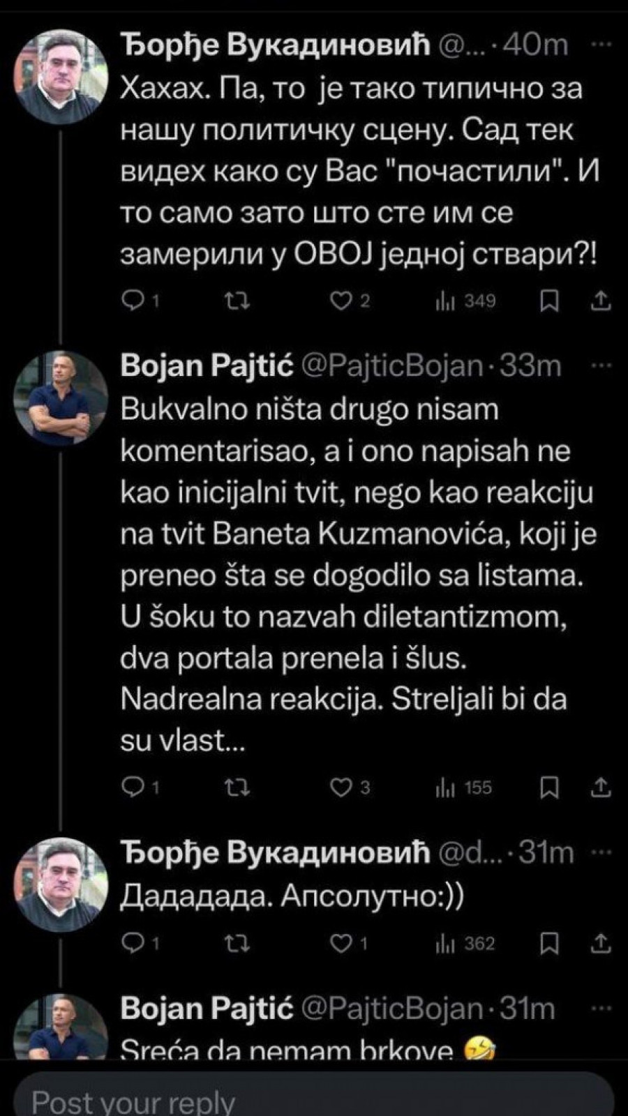Zanimljiva konverzacija odvijala se na društvenoj mreži Iks između Bojana Pajtića i Đorđa Vukadinovića, u kojoj je Pajtić, između ostalog,. konstatovao da ukoliko bi predstavnici opozicionih partija zbog različitog mišljenja "streljali da su vlast i", ukazavši da ne mogu da podnesu drugo mišljenje.
