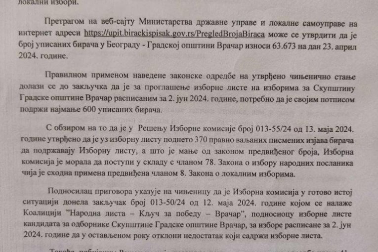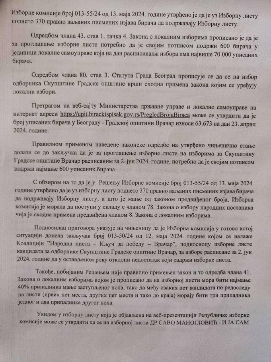 - U rešenju Izborne komisije stoji da je uz izbornu listu Sava Manojlovića dostavljeno 370 valjano potpisanih pismenih izjava, dok Zakon propisuje 600 neophodnih izjava u jedinicama lokalne samouprave koje u trenutku raspisivanja izbora imaju najviše 70.000 upisanih birača (Vračar ima 63.673 birača);