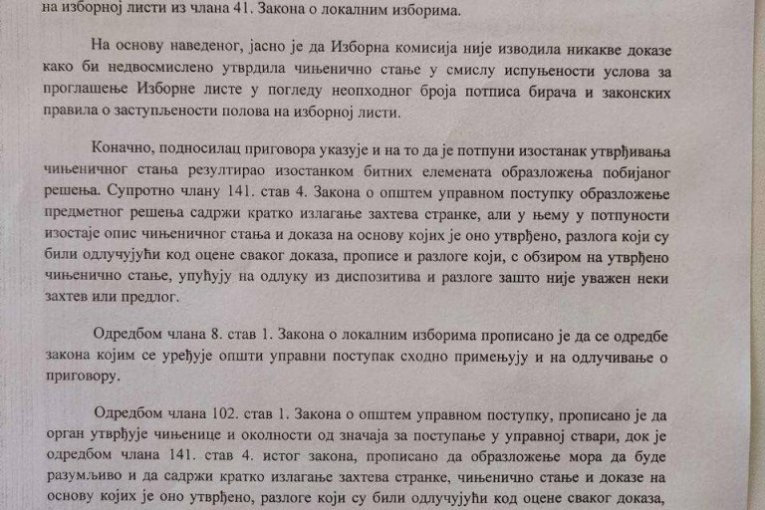 Naime, Izborna komisija je u pobijanom rešenju konstatovala da je uz izbornu listu priložena dokumentacija propisana članom 42 Zakona o lokalnim izborima, čijim pregledom je utvrđeno da je pravno valjana, ne navodeći koliko je podneto pravno valjanih pismenih izjava birača koji podržavaju Izbornu listu. -