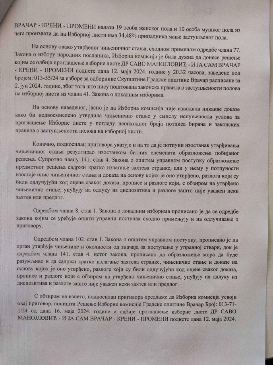 - Rešenjem nije pravilno primenjen član 41 Zakona o lokalnim izborima koji nalaže da na izbornoj listi mora da bude najmanje 40% pripadnika manje zastupljenog pola, tako da među svakih 5 kandidata po redosledu na listi (prvih 5 mesta, drugih 5 mesta i tako do kraja) moraju biti tri pripadnika jednog i dva pripadnika drugog pola. Na listi Manjlovića za Vračar je 19 osoba ženskog i 10 osoba muškog pola, što je 34,48 % pripadnika manje zastupčjenog pola.