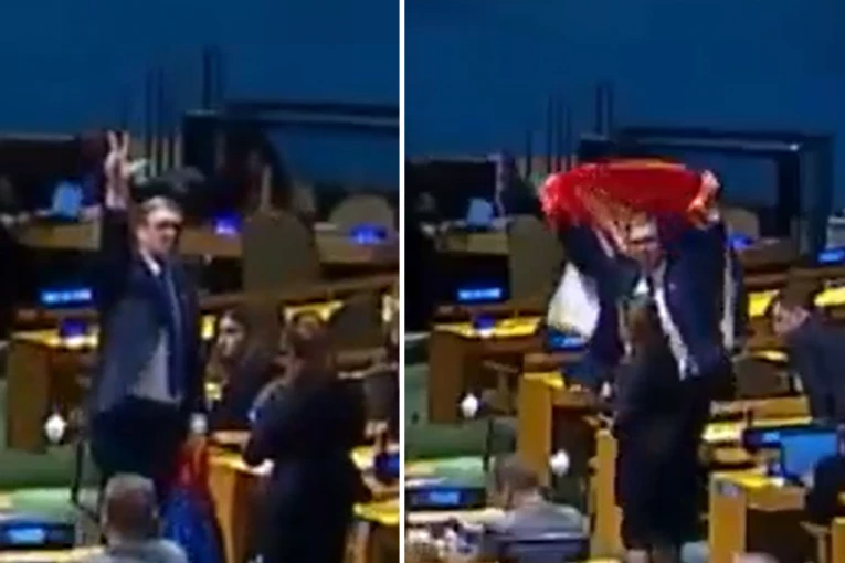 Aleksandar Vučić podigao tri prsta i srpsku zastavu raširio u UN.