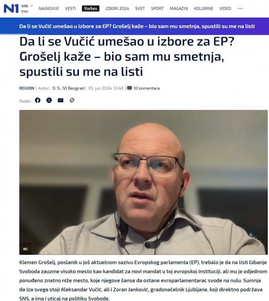 - Da, prema svemu što se desilo posle moga rada, kao posmatrača izbora u Srbiji, sumnjam da je bilo uticaja na moju kandidaturu na listi Svobode. Pre svega su mi nepoznati razlozi kako sam iz kandidata, kom je bila obećana jaka pozicija u izborima za EP za nekoliko sedmica, postao kandidat koji zaslužuje mesto na kojem su moje izborne šanse jednake nuli (osmo mesto, prim. aut.) - istakao je juče Grošelj za, gle čuda, tajkunski portal N1.