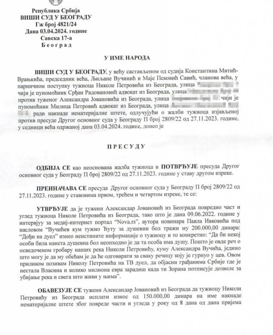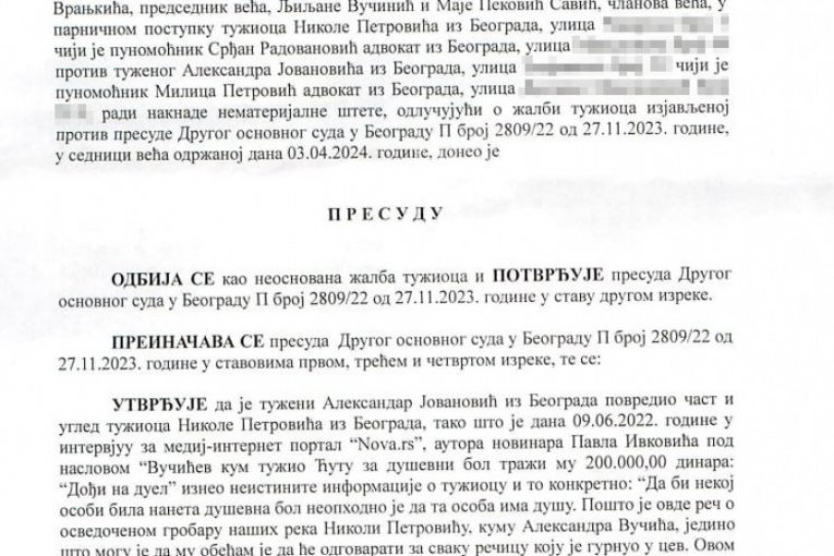 VIŠI SUD U BEOGRADU DONEO PRAVOSNAŽNU PRESUDU! Ćuta za laži plaća Petroviću 150.000!