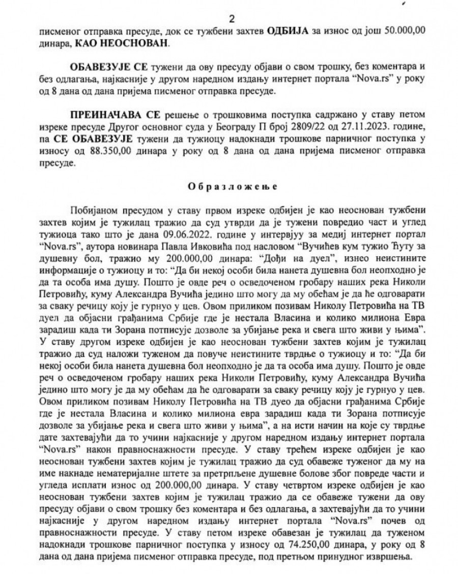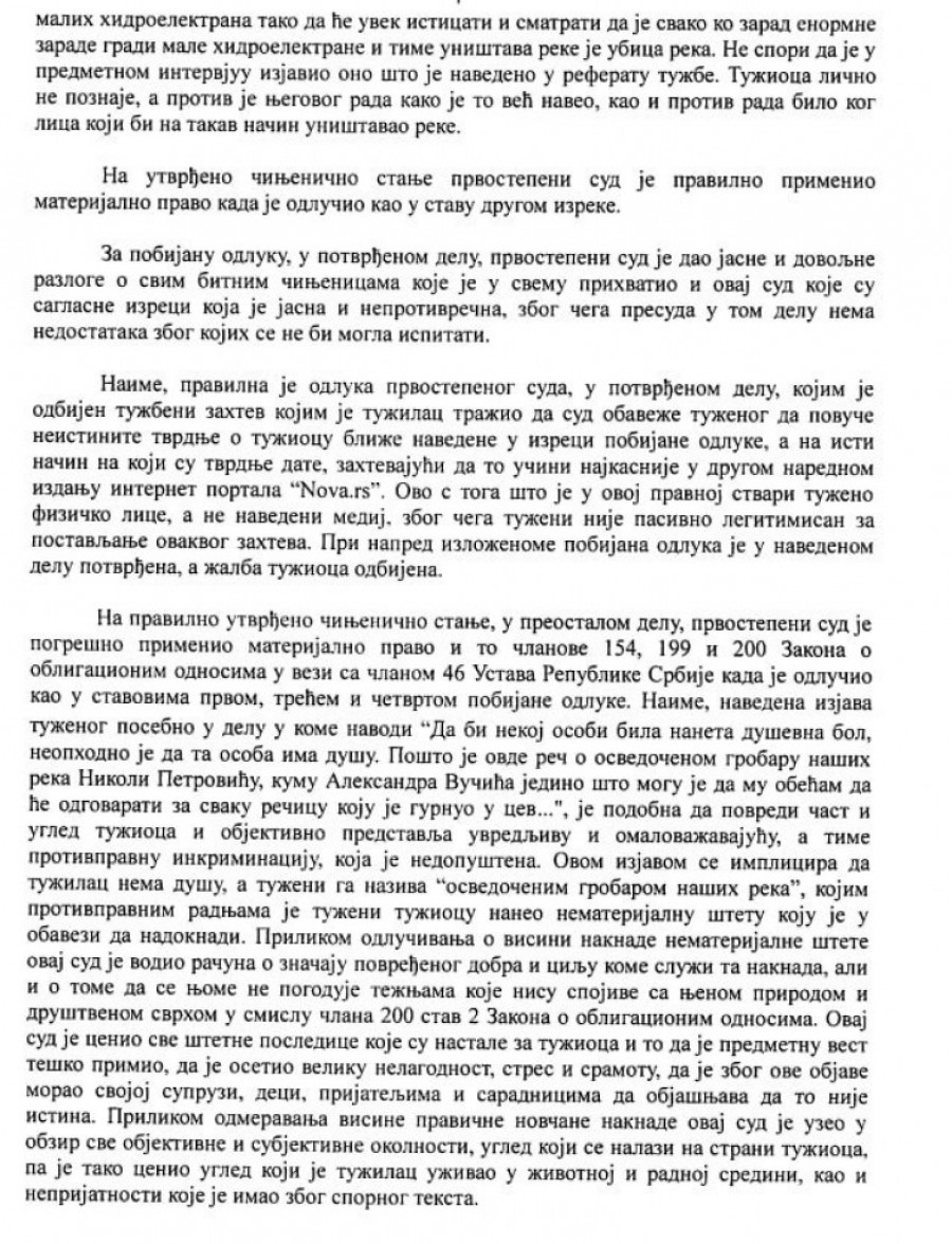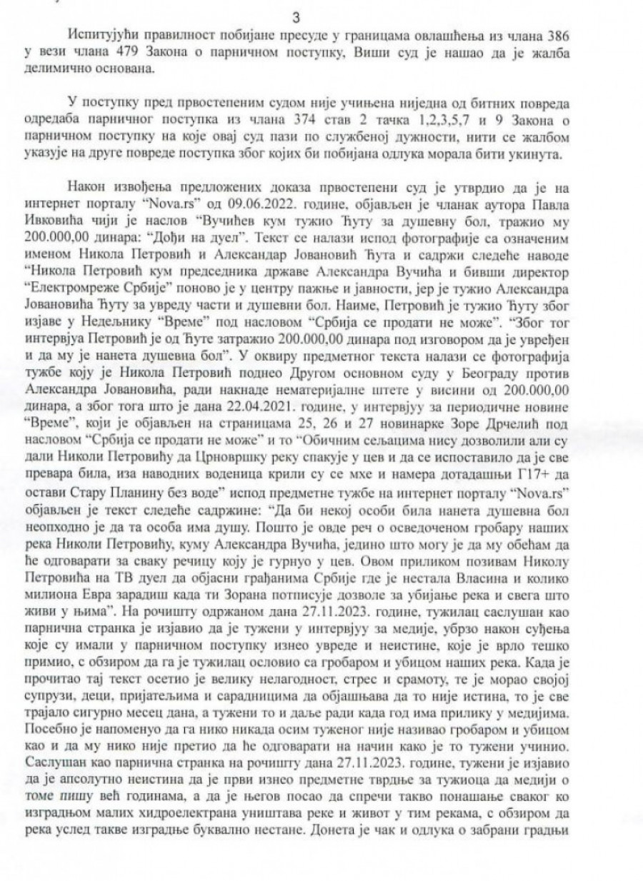 Naime, prema obrazloženju odluke kojom se žalba odbacuje, Ćuta je u intervjuu za portal Nova 9. juna 2022. izneo laži i uvrede na račun Petrovića. On ga je u tekstu pod naslovom "Vučićev kum tužio Ćutu za duševni bol, traži mu 200.000 dinara: Dođi na duel" slagao da je "grobar naših reka" i da na osnovu toga zarađuje milione.