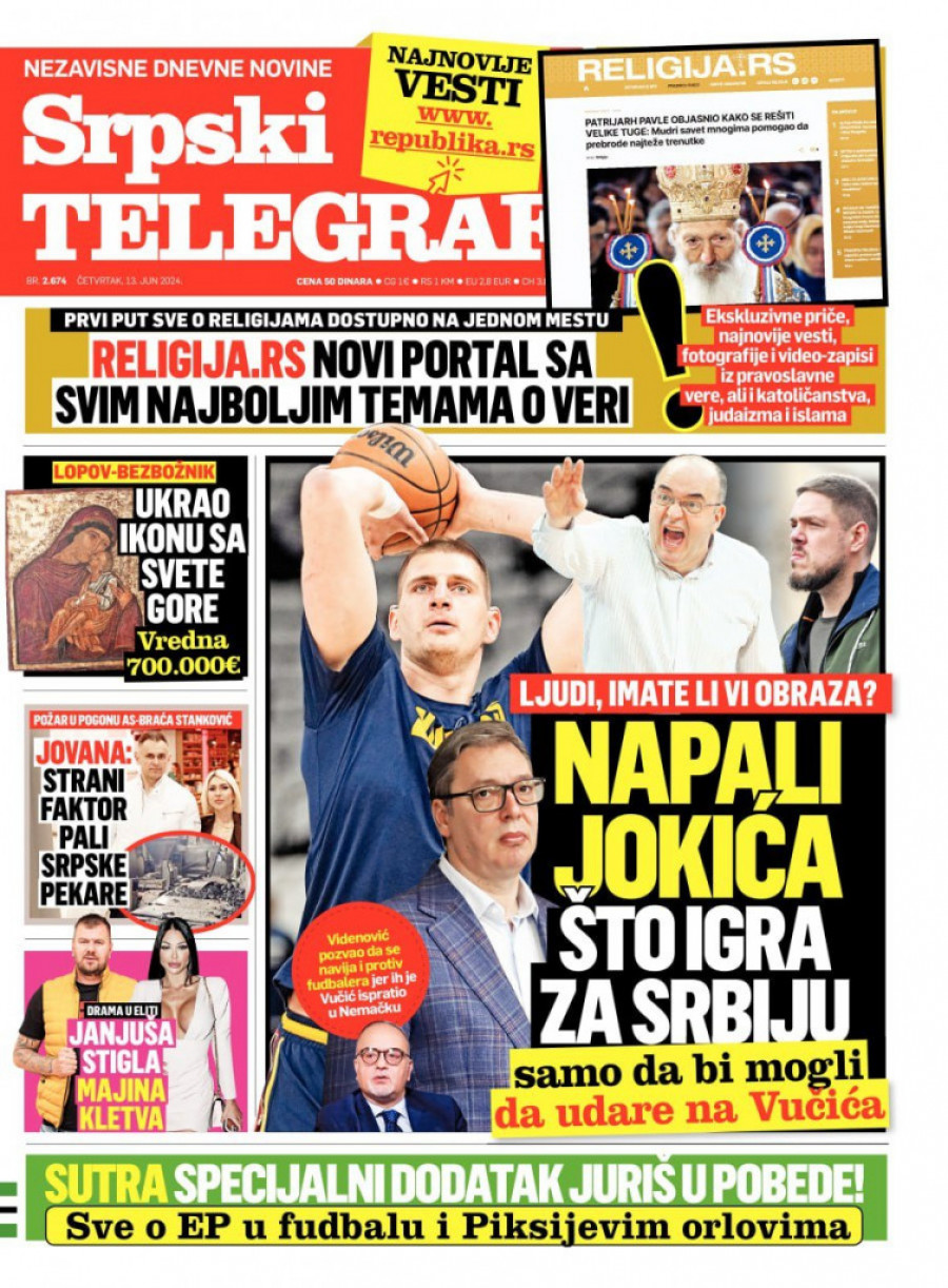 Naslovna strana Srpskog telegrafa za 13. jun 2024.