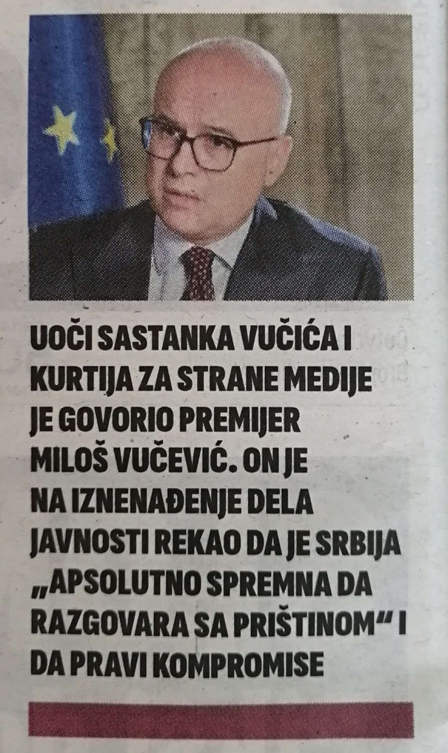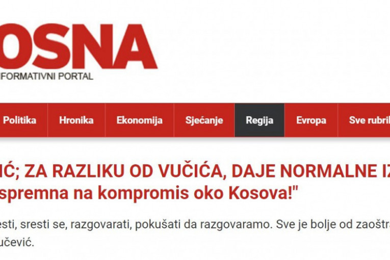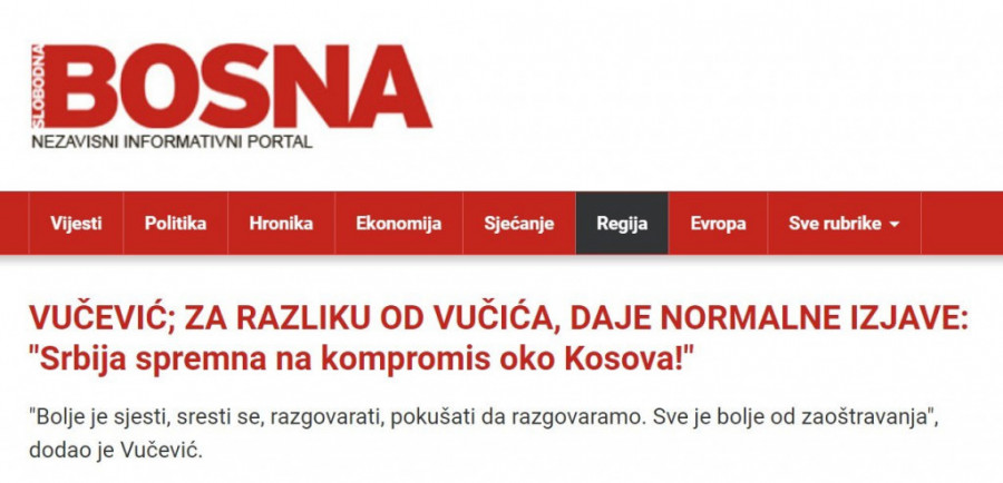 Počelo je pokušajem sarajevskog portala Slobodna Bosna da izmišljenom izjavom premijera Miloša Vučevića podmetne jabuku razdora srpskom rukovodstvu. Tako su, iako je premijer ponovio ono što je ko zna koliko puta rekao i predsednik Vučić, Slobodna Bosna stavila naslov koji kaže da "Vučević, za razliku od Vučića, daje normalne izjave". U originalnom tekstu intervjua koji je Vučević, inače, dao za AFP, i to na srpskom jeziku, jasno stoji da rešenje za Kosovo ne može biti da neko dobije sve, a neko ništa, te da kompromis podrazumeva da obe strane budu jednako zadovoljne ili nezadovoljne. Ništa sporno, kao što rekosmo, to je i Vučić izgovorio u mnogo navrata.