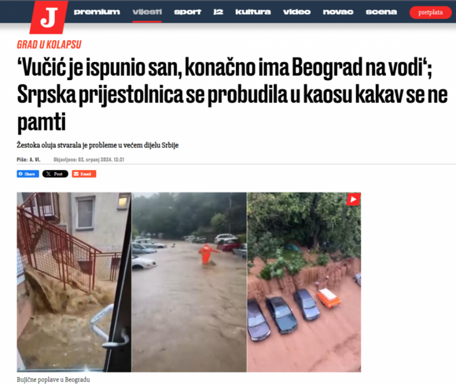 Naslov teksta u Jutarnjem listu glasi: "Vučić je ispunio san, konačno ima Beograd na vodi; Srpska prestolnica se probudila u haosu kakav se ne pamti", a u samom tekstu prenose se objave na društveni mrežama u kojima se ismeva drama kroz koju su prošli građani zbog nezapamćenog nevremena.
