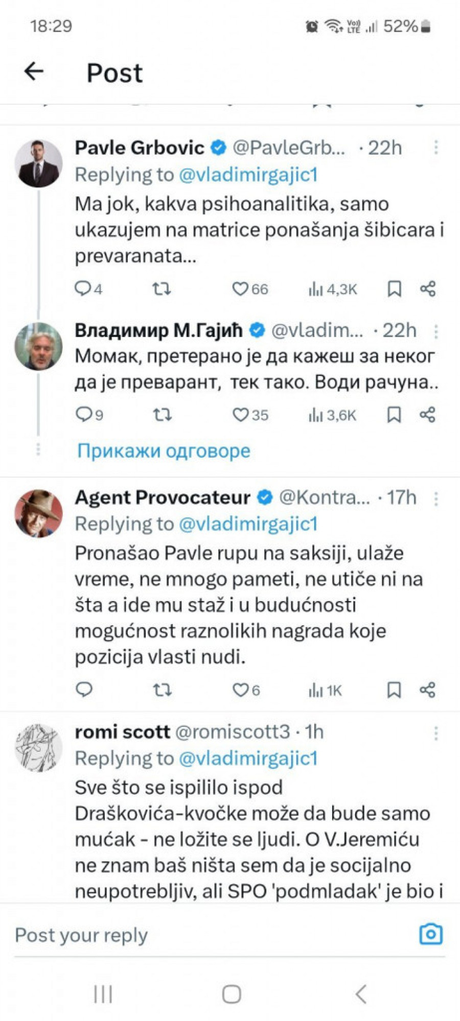 - Slučaj Narodne stranke ni po čemu nije jedinstven, već samo potvrđuje da je preagresivno opoziciono moralisanje jasan simptom latentnog naprednjaštva. Kada je čovek u nešto siguran, ne oseća potrebu da to milion puta ponavlja. Kada neko toliko agresivno nameće merila opozicionarstva, to je najčešće zbog teške borbe s naprednjakom u sebi - naveo je Grbović na Tviteru.