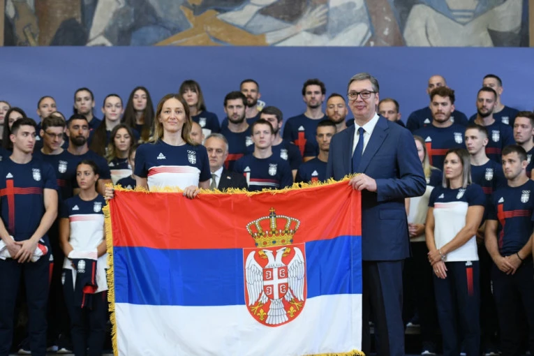 Juče je predsednik, kao šlag na tortu, ispratio naše sportiste na Olimpijske igre u Parizu, a kapitenu odbojkaške reprezentacije Srbije Maji Ognjenović uručio je zastavu Srbije, koju će ona, zajedno sa kapitenom vaterpolo reprezentacije Dušanom Mandićem, nositi na svečanom otvaranju Olimpijskih igara.