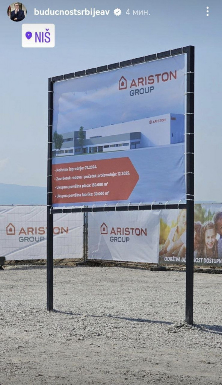 "Deseta fabrika stiže u Niš. Reč je o Aristonu, italijanskoj kompaniji sa prihodom od preko tri milijarde evra na godišnjem nivou", napisao je on ranije na svom Instagram profilu "Budućnost Srbije".