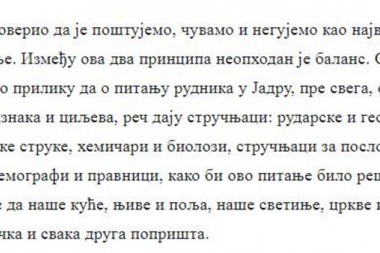- Stoga se molimo bogu da nas umudri da damo priliku da o pitanju rudnika u Jadru, pre svega, odgovorno i savesno, bez ideoloških predznaka i ciljeva, reč daju stručnjaci: rudarske i geološke, šumarske, agronomske i ekološke struke, hemičari i biolozi, stručnjaci za poslovnu, makroekonomiju i vojnu geografiju, demografi i pravnici, kako bi ovo pitanje bilo rešavano kao egzistencijalno, a ne da naše kuće, njive i polja, naše svetinje, crkve i manastiri, budu pretvoreni u politička i svaka druga poprišta - poručio je Jerotej i dodao: