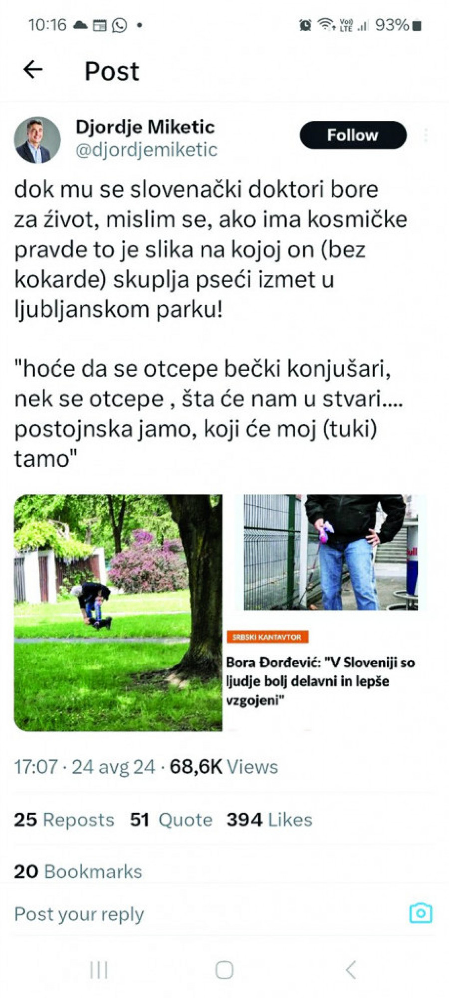 Uz fotografije Bore Čorbe kako šeta psa i skuplja izmet za njim u parku u Ljubljani, Miketić je napisao na svom nalogu: