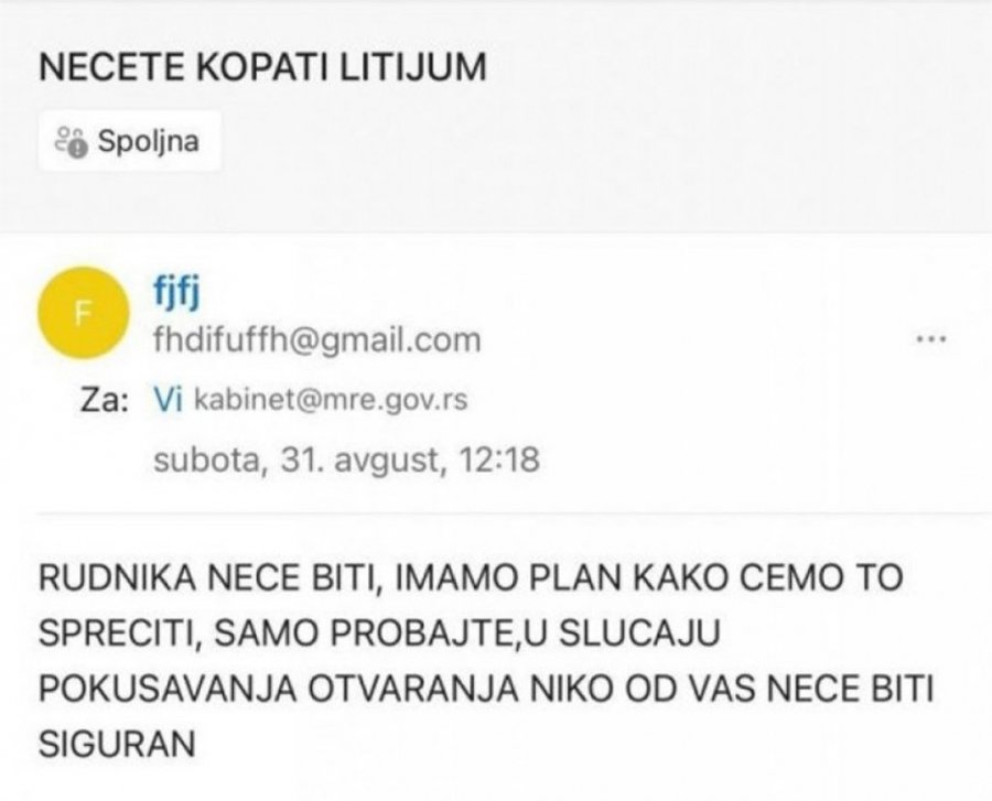 - Rudnika neće biti, imamo plan kako ćemo to sprečiti, samo probajte, u slučaju pokušavanja otvaranje niko od vas neće biti siguran - navodi se u tom mejlu.