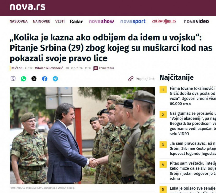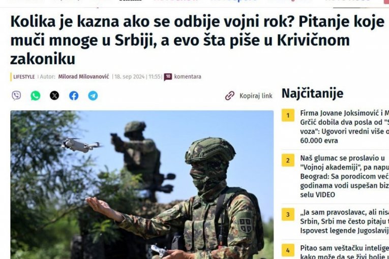 Svakog dana otkako je objavljena odluka o tome, smenjuju se naslovi kojima je jedini cilj da vojni rok u trajanju od 75 dana obesmisle, nipodaštavaju, izvrgnu ruglu ili vam preporuče, ukoliko se uklapate u starosnu granicu, kako možete izbeći odlazak u kasarnu ili koliku ćete kaznu platiti ako se o poziv oglušite. Istovremeno, salve napada stižu iz Prištine, ali i s domaće političke scene, pa se tako bivši načelnik Generalštaba Zdravko Ponoš, umesto da se pokrije ušima i ćuti, ne skida iz medija. Zaboravlja, pritom, da kaže da Hrvatska, zemlja čiji pasoš pored srpskog ima, takođe uvodi obavezan vojni rok i to pre nas, mada je članica NATO.