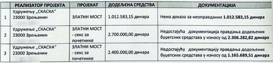 Naime, iz dokumenata se vidi da je u prvoj transakciji prebačeno 1.012.583 dinara, dok su za projekat "Zlatni most - seks za početnike" obavljene dve transakcije, od 2.700.000 i 2.400.000, odnosno ukupno 5.100.000 dinara.