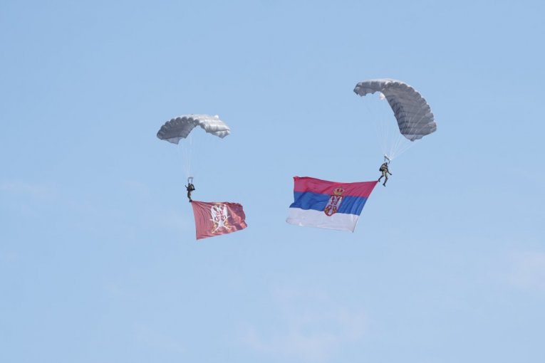 Padobranci 63. specijalne brigade izvršili su demonstrativni skok iz helikoptera noseći zastave Republike Srbije.