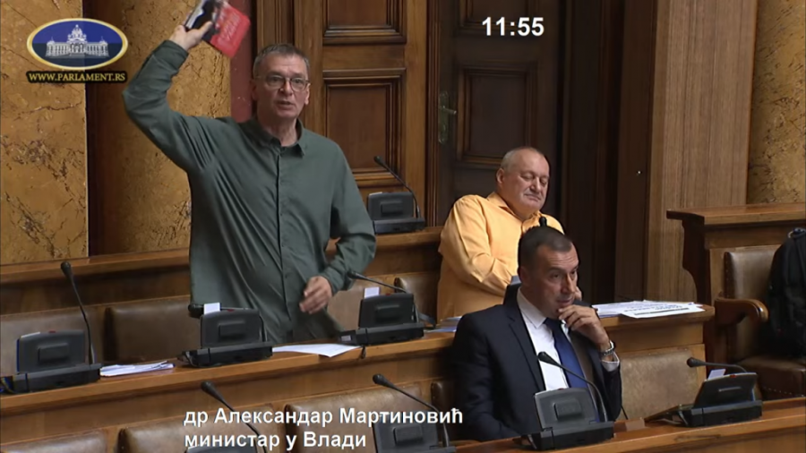 Na snimku se jasno vidi kako Jovanović, revoltiran, baca knjigu prema ministrima i mestu za predsedavajućeg.