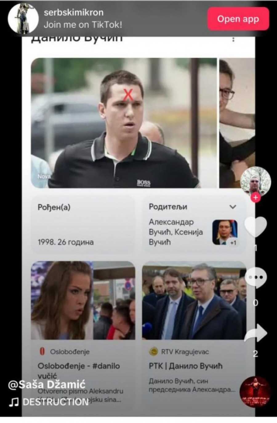 Srpski tiktoker postavio je na svoj nalog slike Danila, Andreja i Anđelka Vučića sa crvenim krugom na čelu