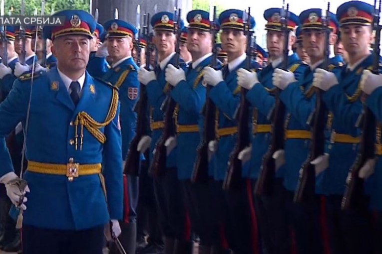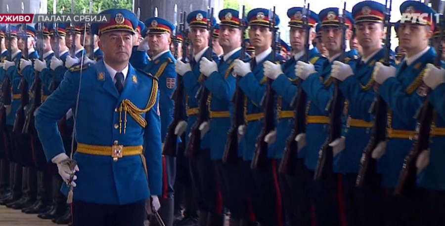 Posle intoniranja himni dveju zemalja, crveni tepih i smotru počasne garde, usledilo je rukovanje sa ministrima Vlade Srbije.
