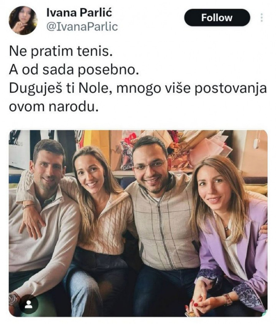 Nije dovoljno Novaku Đokoviću što je najbolji teniser svih vremena, što pomaže šakom i kapom, srpska opozicija bi da legendarni as razmišlja i radi kao oni. Koristi se svaka prilika za linč, a o tome najbolje govori primer Ivane Parlić, bivše potpredsednice i poslanice Narodne stranke, koja se na Noleta obrušila jer se usudio, o strahote, da se, zajedno sa suprugom Jelenom, slika s ministarkom energetike Dubravkom Đedović Handanović i njenim suprugom Damirom Handanovićem.