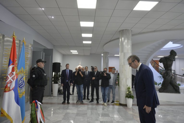 Nakon obraćanja, predednik BIA Vladimir Orlić uručio je zlatnu medalju za posebne zasluge predsedniku Srbije Aleksandru Vučiću.