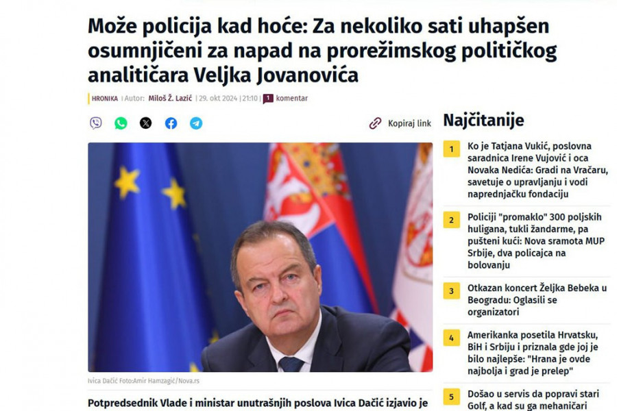 O tome najbolje svedoči način na koji su izveštavali o ovoj temi, uzevši u obzir da su preneli izjavu Ivice Dačića o hapšenju osumnjičenih za napad na Veljka Jovanovića, sa naslovom u kojem ga oslovljavaju sa "prorežimski analitičar".