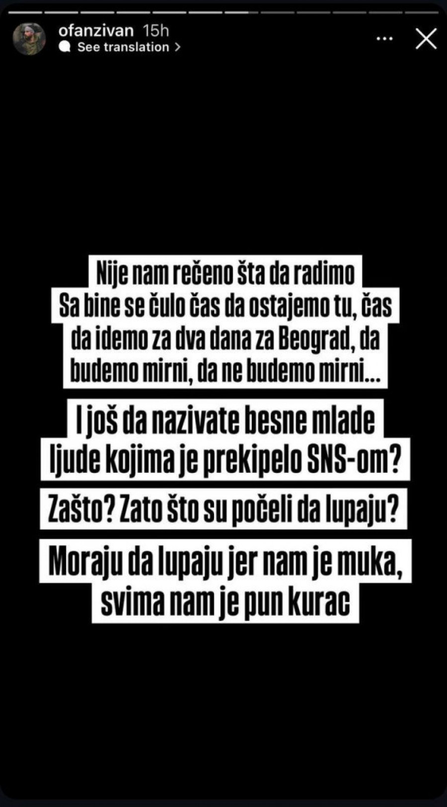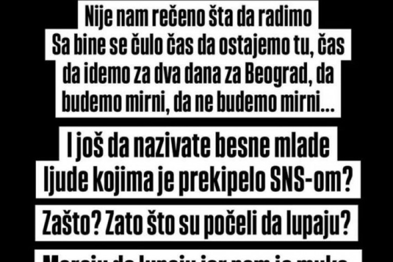 "Nije nam rečeno šta da radimo. Sa bine se čulo čas da ostajemo tu, čas da idemo za dva dana za Beograd, da budemo mirni, da ne budemo mirni... I još da nazivate besne mlade ljude kojima je prekipelo SNS-om?