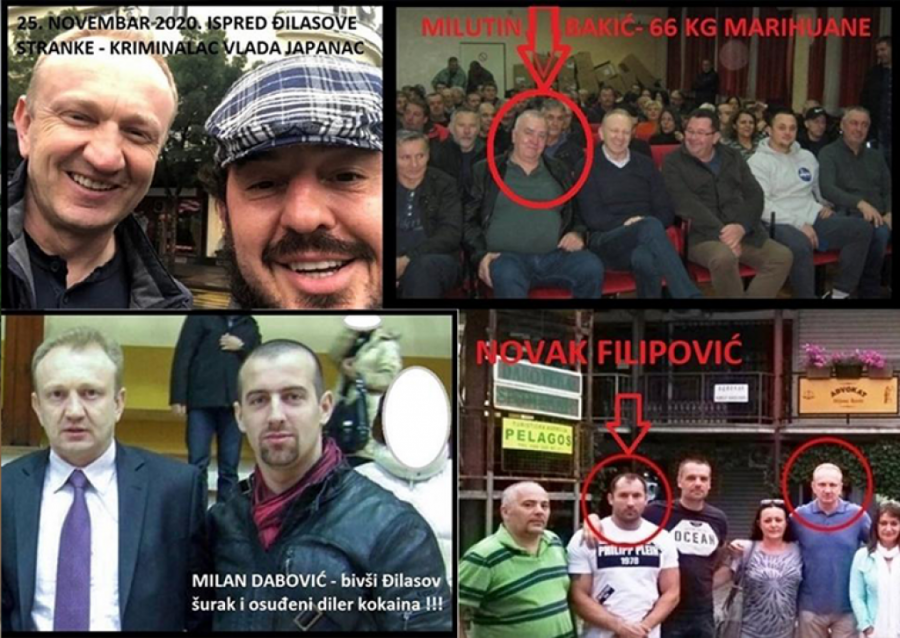- Dokaza o njihovoj uskoj povezanosti sa kriminalnim miljeom je na pretek. Sastanci Đilasa sa Vladimirom Jovanovićem, zvanim Vlada Japanac novembra 2020. godine, a koji se prvi put pominje u beloj knjizi MUP 2001, kao član "zemunskog klana". Vlada Japanac, čovek s ozbiljnim kriminalnim dosijeom i koji je proveo po zatvorima niz godina, uhapšen je nekoliko sati posle sastanka sa Đilasom. Sledeći na spisku Đilasovih kriminalnih pajtaša je Milutin Brkić, koji je uhapšen aprila 2020. zbog šverca 66 kilograma marihuane. Ostalo je zabeleženo da se Đilas u Kuršumliji slikao sa ovim narko dilerom. Bivši šurak Đilasa, Milan Dabović, uhapšen je septembra 2016. sa 2,4 kilograma čistog kokaina! Osuđen je na šest godina zatvora, a Đilas ga je više puta posećivao u zatvoru, nosio hranu i potrepštine. Decenijski prijatelj Marinike Tepić, bivši član Glavnog odbora Đilasove SSP, Novak Filipović iz Pančeva je još jedan "ugledni" prijatelj ove družine, uhapšen je 2020. zbog neovlašćene proizvodnje, stavljanja u promet opojnih droga i nedozvoljenu proizvodnju, držanje i promet oružja, a prilikom njegovog hapšnjenja zaplenjeno je 1,4 kilograma droge i velika količina municije. Marinika Tepić je ovom kriminalcu, dok je bila pokrajinski sekretar za sport i omladinu, svake godine davala novac iz budžeta Vojvodine za potrebe njegovog kluba. Sam je govorio da je od njega tražila da proganja i napada novinare. Pored ovih "divnih ljudi", Đilasovi najbliži saradnici su tokom godina hapšeni i optuživani za najteža krivična dela – Aleksandar Bjelić, Zvonimir Nikezić, Bojan Milić, Aleksandar Stamenković, Nenad Milenković, Dejan Čokić... Zaista impozantna lista kriminalaca i narko-dilera, sve samih "uglednih" građana naše zemlje, bliskih prijatelja i saradnika Dragana Đilasa i Marinike Tepić, od kojih bismo svašta mogli da čujemo, ali su ostali nemi i gluvi, plašeći se za sopstvene poslove i marifetluke! Gotovo sam siguran da bi Marinika bila sjajan svedok saradnik ili zaštićeni svedok - zaključio je predsednik Vlade Srbije.