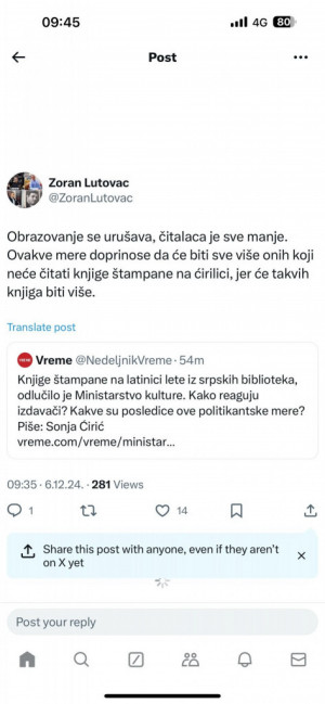 - Obrazovanje se urušava, čitalaca je sve manje. Ovakve mere doprinose da će biti sve više onih koji neće čitati knjige štampane na ćirilici, jer će takvih knjiga biti više - naveo je on na svom nalogu.