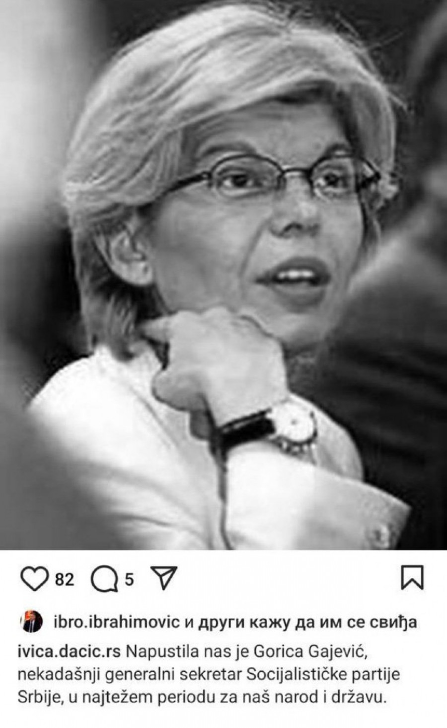 Ivica Dačić je na svom Instagram profilu objavio da je preminula Gorica Gajević u 67. godini, nekadašanji generalni sekretar Socijalsitičke partije Srbije.