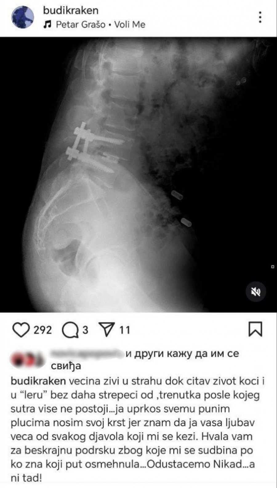 - Većina živi u strahu dok čitav život koči i u "leru" bez daha strepeći od tačke pucanja, trenutka posle kojeg sutra više ne postoji... Ja uprkos svemu punim plućima gazim gas "do panja" jer znam da je vaša ljubav veća od svakog đavola koji mi se kezi. Hvala vam za beskrajnu podršku zbog koje mi se sudbina po ko zna koji put osmehnula... Odustaćemo nikad... a ni tad - napisao je Jovanović na svom Fejsbuk profilu.