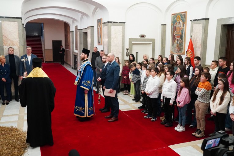 Badnjak je u holu zgrade osveštao episkop Petar, a osim predsednika Vučuća unošenju Badnjaka prisustvovala su i deca srpske nacionalnosti iz Rumunije i Crne Gore koja borave u Beogradu povodom božićnih praznika.
